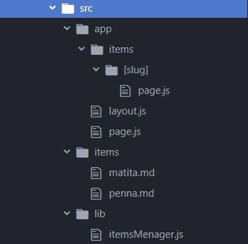 Il percorso dinamico lo si trova al seguente percorso: src/app/items/[slug], il file page.js al suo interno ci permetterà di creare il percorso dinamico, ma iniziamo facendo un passo alla volta. Il sito basilare che andremo a creare ci permetterà di visualizzare nella home page una serie di prodotti, in questo caso i prodotti saranno: matita e penna. Quindi in questo caso i percorsi dinamici saranno: src/app/items/matita e src/app/items/penna, ma si può pensare di creare pure percorsi dinamici per: gomme, fogli, cartelle e altro…